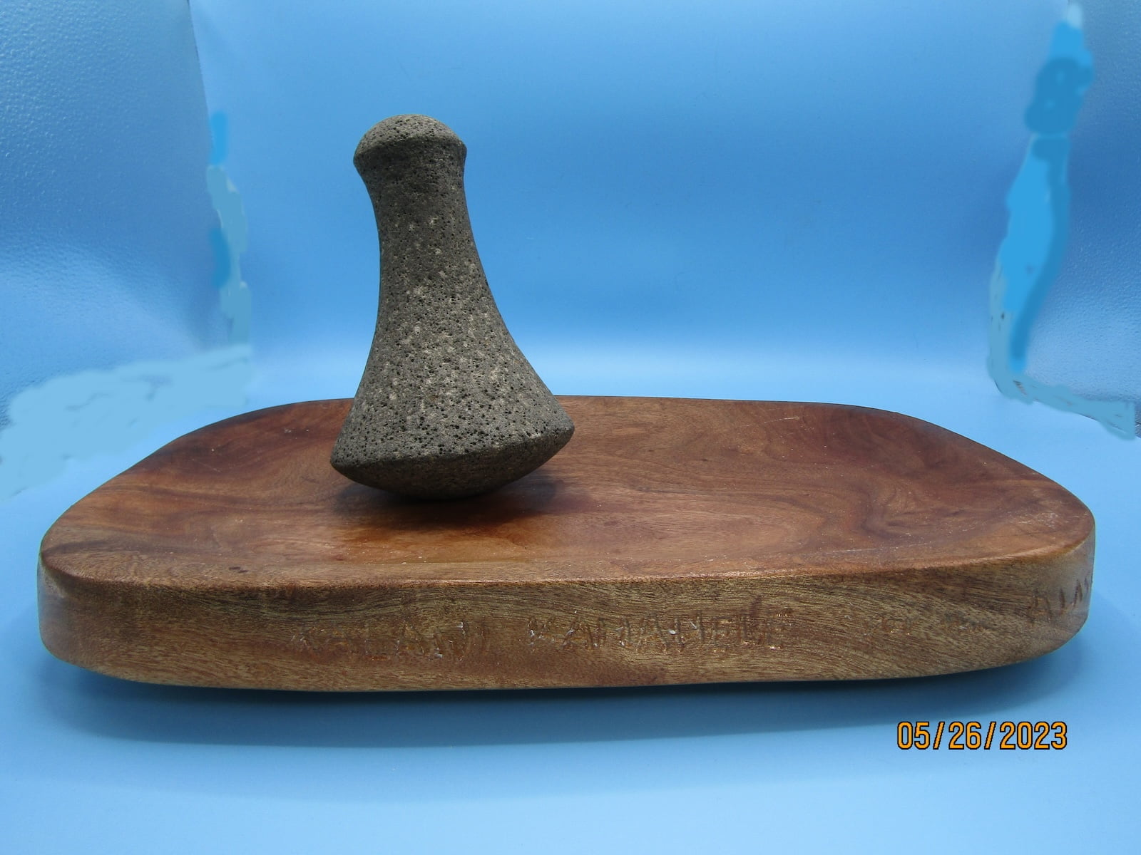 The poi pounder (Na pohaku kui poi) originated in Hawaii, where the indigenous people used it as a tool to mash cooked taro into poi, a traditional Hawaiian dish. In order to make poi, the taro was first cooked for three to four hours in an underground oven called an imu. Then, after being peeled, the taro went onto a wetted wooden board to be pounded. The surface of the poi pounder would be wetted between each impact, the taro became a thick paste called paiai, which, thinned by water, made poi.