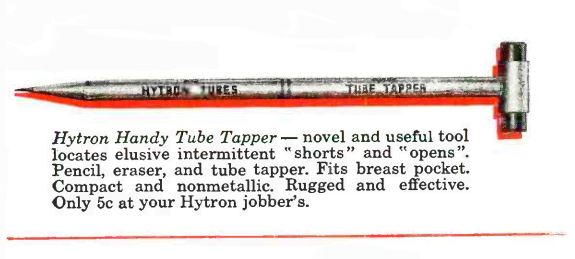 Electronics companies, such as Hytron Handy, developed tube tappers like the one seen here. These little hammers served several purposes. The tool, as the name suggests, was used to tap hytron vacuum tubes. These tubes were the basis of most electronic devises in the early twentieth century, such as televisions and radios. By tapping on the tubes, television repairmen or the average person could locate where the tube was “microphonic.” As one 1940s advertisement put it, the “novel and useful tool locates elusive, intermittent shorts.”